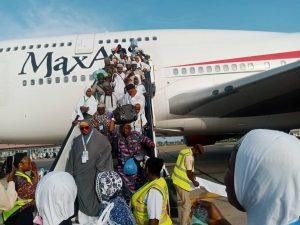 Max Airline flight carrying the five hundred and forty-eight pilgrims including one official from the state and nine officials from NAHCON, touched down at the Babatunde Idi-Agbon International Airport, Ilorin at exactly twenty-six minutes past five this evening.