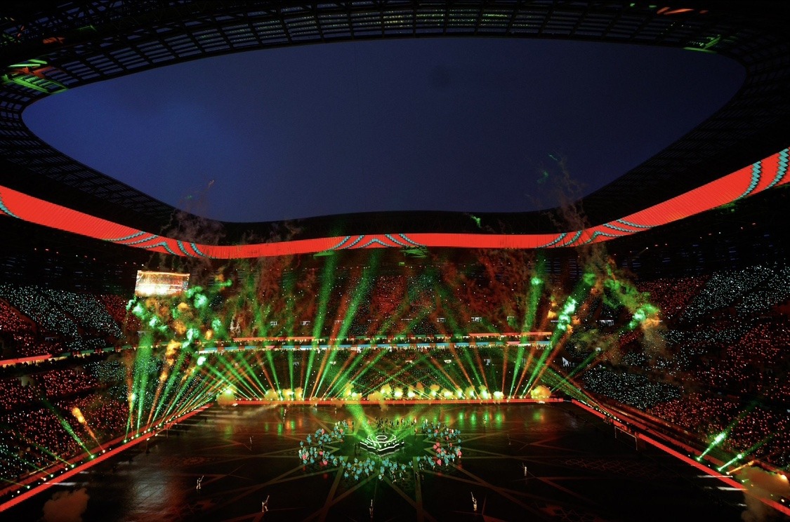 Performers moved in carefully choreographed patterns across a pitch transformed by colour and light, reflecting the continent’s diversity and football heritage.