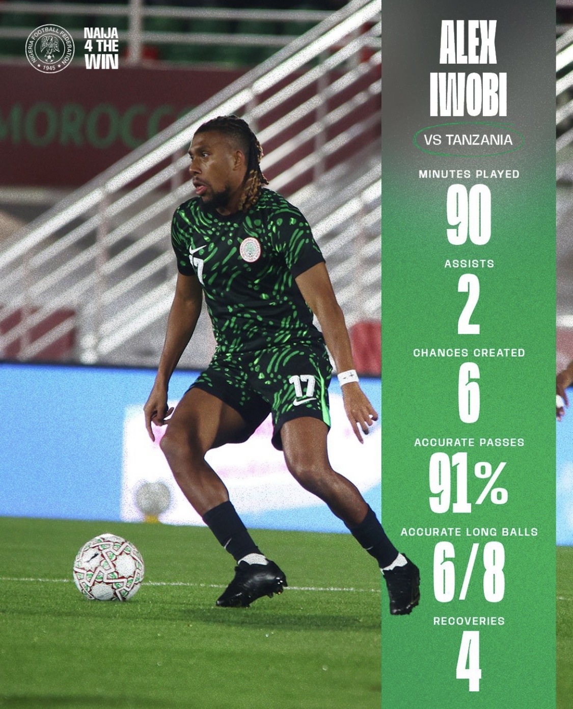 Midfielder Alex Iwobi recorded two assists against Tanzania, his first assists at AFCON in his 19th appearance.