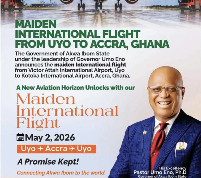 The Commissioner for Information, Dr. Aniekan Umanah, in a statement announced that, “the Akwa Ibom State Government hereby announces the maiden international flight from Victor Attah International Airport, Uyo, to Kotoka International Airport, Accra, Ghana, on Saturday, May 2, 2026.”