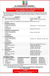 The All Progressives Congress (APC) has scheduled its Presidential Primary Election for May 15 and 16, 2026, with nomination and expression of interest forms pegged at a combined N100 million.