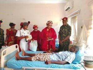 The Chief Medical Director (CMD), 44 Nigerian Army Reference Hospital, Brigadier General Godwin Ogoh, received the NDAOWA Co-ordinator and led her to wards where the wounded soldiers were undergoing treatments.