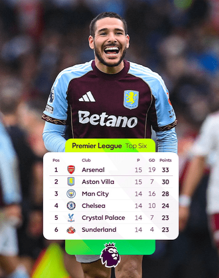Arsenal have 33 points after 15 games in the Premier League, while Villa are in third place on 30 points.