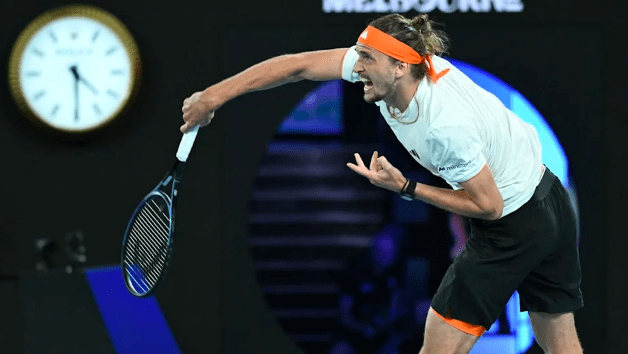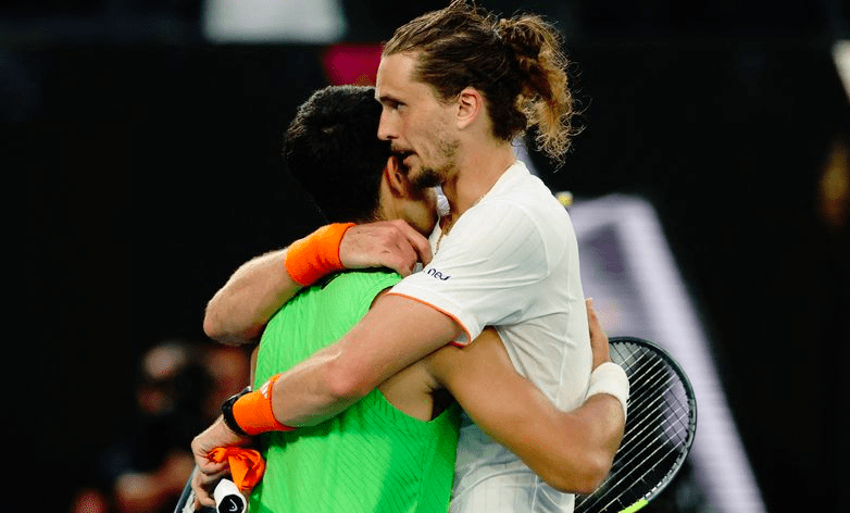 After eight straight holds of serve on a sunbathed Rod Laver Arena, Alcaraz was gifted the opening break when Zverev produced a double fault, and the Spaniard won the next game to love and pocketed the opening set.