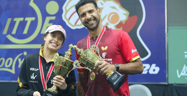 Egyptian table tennis stars, Hana Goda (L) and Omar Assar (R) with 2026 ITTF Africa Cup trophies.