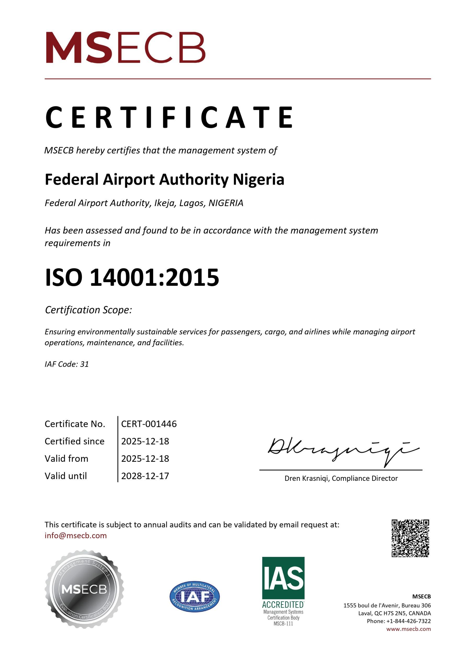 The Federal Airports Authority of Nigeria (FAAN) has successfully attained two internationally recognised certifications: ISO 9001:2015 (Quality Management System) and ISO 14001:2015 (Environmental Management System).