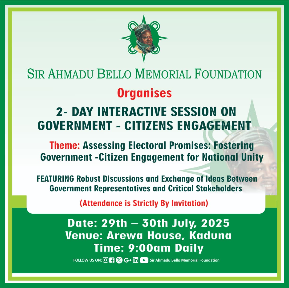 In a bid to strengthen transparency and public accountability in the nation’s affairs, the Sir Ahmadu Bello Memorial Foundation (SABMF) is hosting a two-day citizen-government engagement forum on 29 and 30 July 2025 in Kaduna.