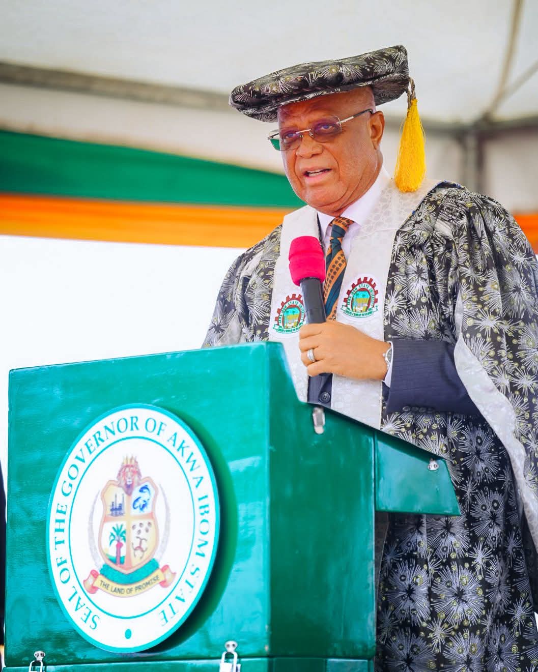 Speaking at the University’s 9th–12th Combined Convocation held at the Main Campus, Ikot Akpaden, the Governor congratulated the graduates on their academic success and resilience.