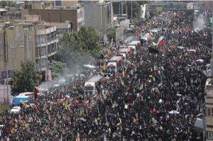 Their coffins were driven into Tehran’s Azadi Square adorned with their pictures as well as rose petals and flowers, as crowds waved Iranian flags. State-run Press TV showed an image of ballistic missiles on display.