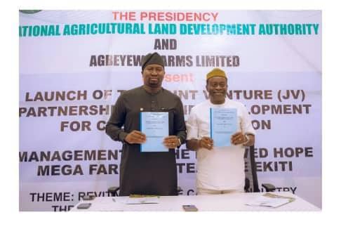The National Agricultural Land Development Authority (NALDA) has entered into a Memorandum of Understanding (MoU) with Agbeyewa Farms Limited to launch a Joint Venture (JV) partnership on land development for cassava production and the management of the Renewed Hope Mega Farm Estate in Irele, Ekiti State.