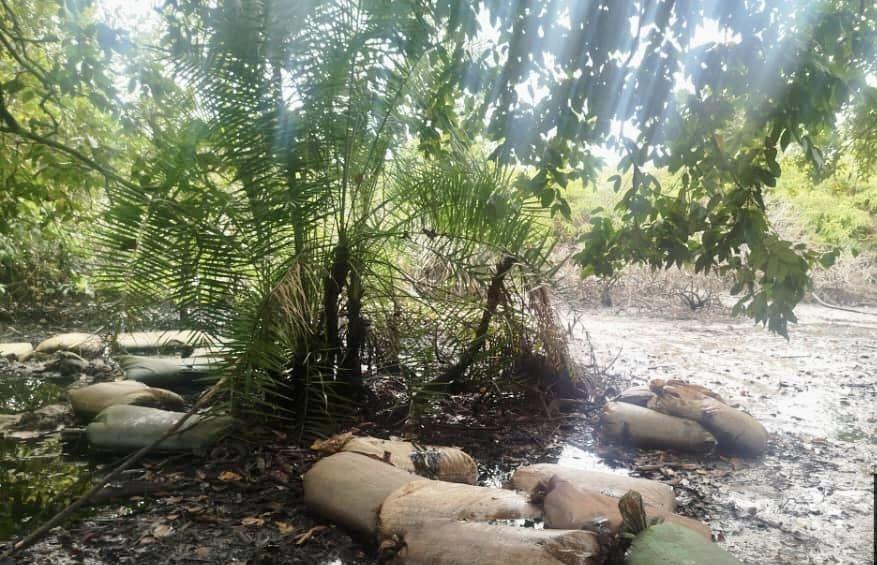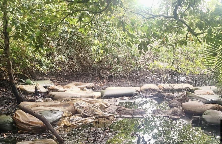 The team discovered an illegal refining site, including dugout pits, locally fabricated cooking and cooling systems, and sacks containing large quantities of substances suspected to be stolen crude oil.