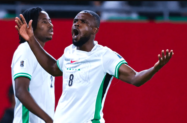 Super Eagles midfielder Frank Onyeka celebrates goal.
