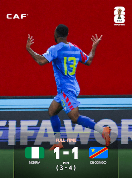 Nigeria were knocked out the 2026 FIFA World Cup qualification race on Sunday, losing 4-3 on penalties to the Democratic Republic of Congo, after a tense 1-1 draw in regulation time, at the Crown Prince Moulay El Hassan Stadium in Rabat, Morocco.