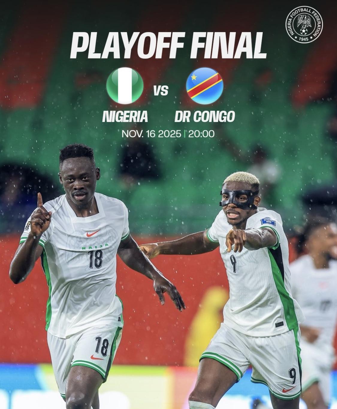 The Super Eagles of Nigeria will face DR Congo in the 2026 FIFA World Cup CAF playoff finale.