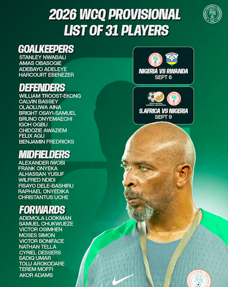 Head Coach of the Nigerian Super Eagles, Eric Sekou Chelle, has unveiled a provisional 31-man squad for the upcoming 2026 FIFA World Cup qualifying fixtures against Rwanda and South Africa in September.