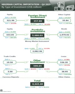 The National Bureau of Statistics (NBS) says Nigeria’s total capital importation in Q4 2025 stood at US$6,443.48 million, higher than US$5,089.16 million recorded in Q4 2024, indicating an increase of 26.61% on a year on year basis.