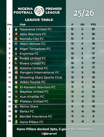- READ ALSO: Nasarawa United Reclaims NPFL Top Spot
