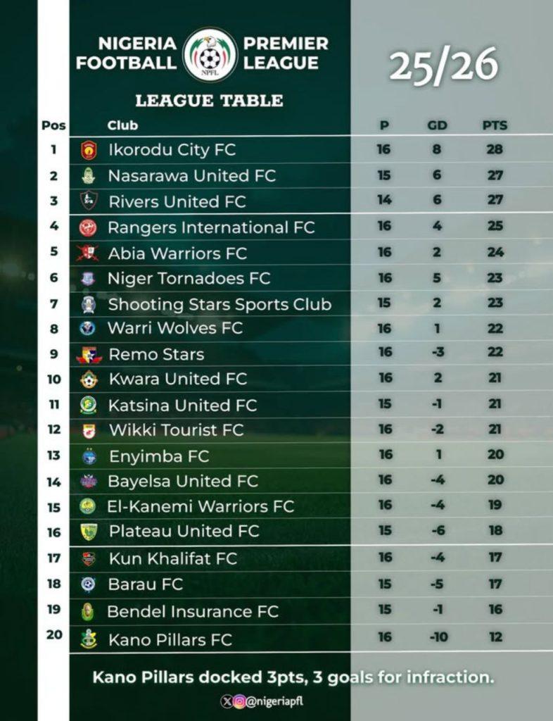 Rangers now sit in fourth position on the log with 25 points from 16 matches, while Bayelsa United are in 14th position with 20 points.