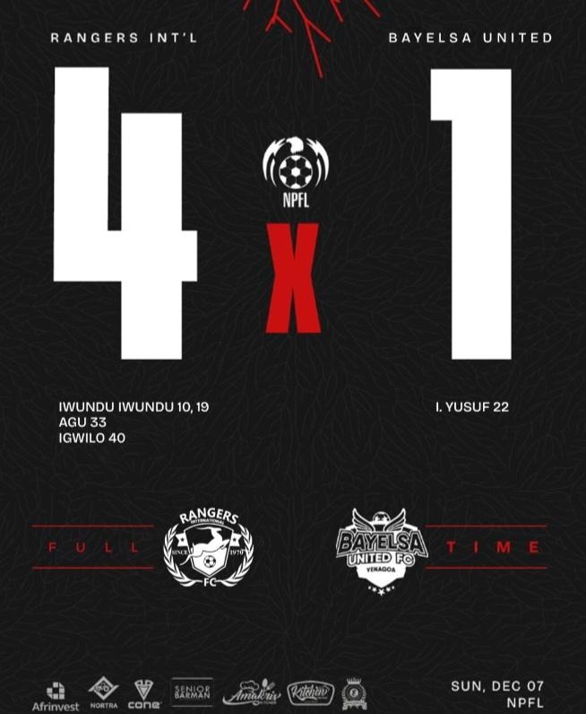 Rangers International FC thrashed Bayelsa United 4-1 in their Match Day 16 Nigeria Premier Football League (NPFL) encounter, at the Nnamdi Azikiwe Stadium in Enugu, Enugu State.