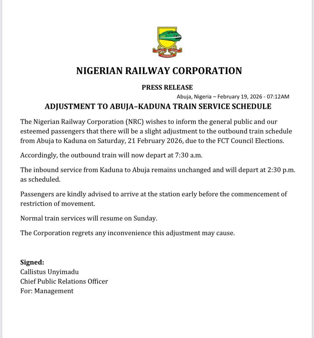 The Nigerian Railway Corporation (NRC) has announced that there will be a slight adjustment to the outbound train schedule from Abuja the nation’s capital to Kaduna State Northwest Nigeria on Saturday, 21st February 2026, due to the Federal Capital Territory FCT Council Elections.