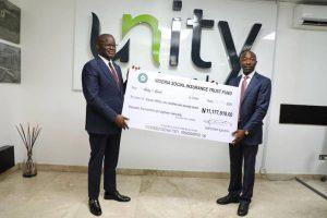 Presenting the cheque at a brief ceremony at the heaquarters of the bank in Lagos State, the NSITF’s Managing Director noted that the sum represents about twenty months’ arrears in death.