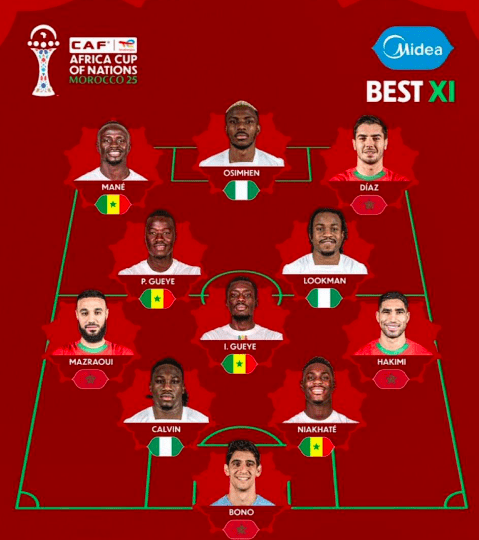 The team, selected by the CAF Technical Study Group (TSG), reflects the dominant performances of the tournament’s top three finishers: champions Senegal, runners-up Morocco and bronze-medalists Nigeria.