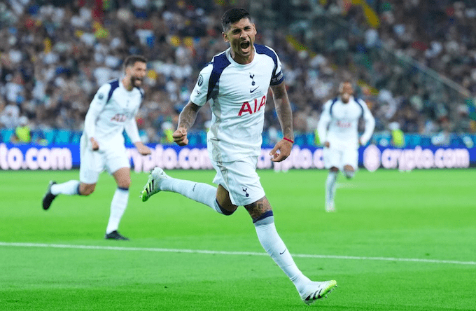 Tottenham Hotspur defender Cristian Romero celebrates goal.