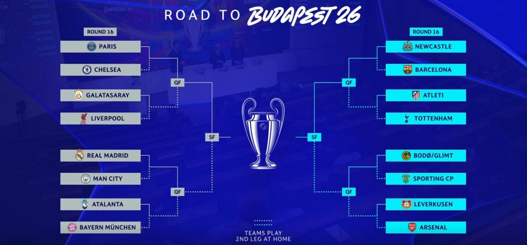Bayern Munich, who were second in the league phase, play Atalanta, who knocked out German side Borussia Dortmund in the playoffs thanks to a stoppage-time penalty, with a quarter-final against Real or City to follow.