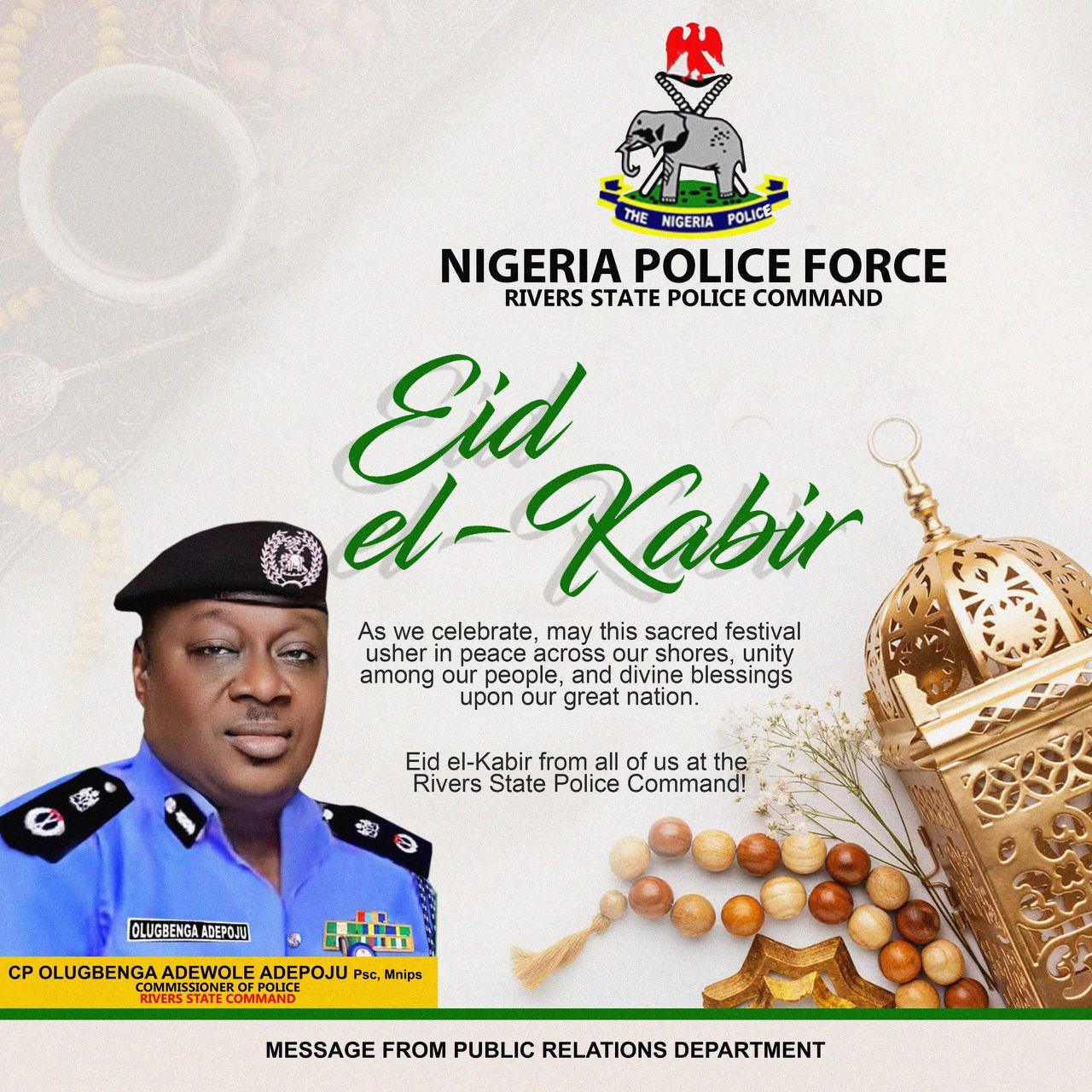 The Commissioner of Police, Rivers State, South-South, Nigeria, Command, Commissioner of Police Olugbenga Adepoju, Psc. mnips, felicitates with the Muslim faithfuls in Rivers State as they join other Muslims in the world to celebrate this year Eid al-Kabir on Friday , June 6, 2025.