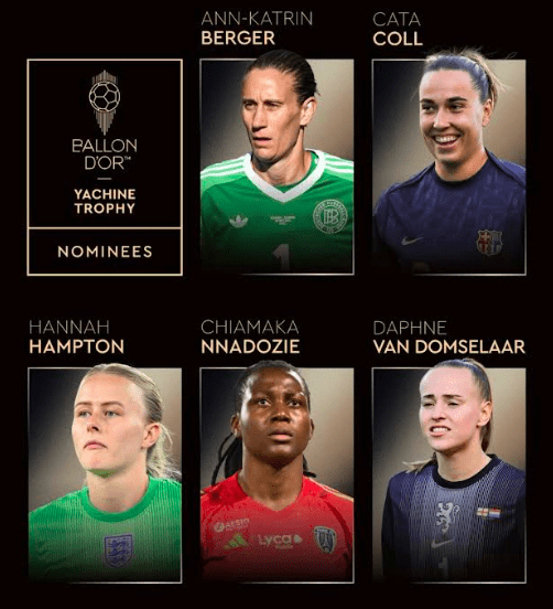 Super Falcons goalkeeper Nnadozie has been nominated for the 2025 Ballon d’Or Yachine Trophy for her brilliant performances.