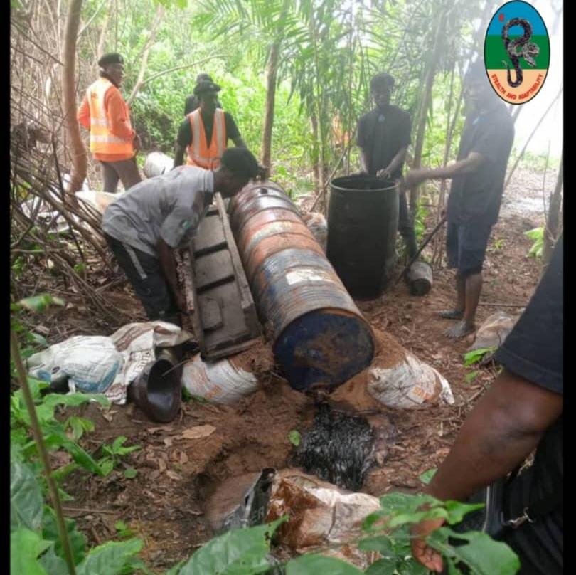 Additionally, 19 big pots, 18 drum pots, 36 drum receivers, 19 drum coolants, a pumping, 6 metallic drum receiver stocked with over 4,000 litres of Illegally refined Automotive Gasoline Oil (AGO) and over 27,600 litres of stolen crude stored in 460 sacks were handled.