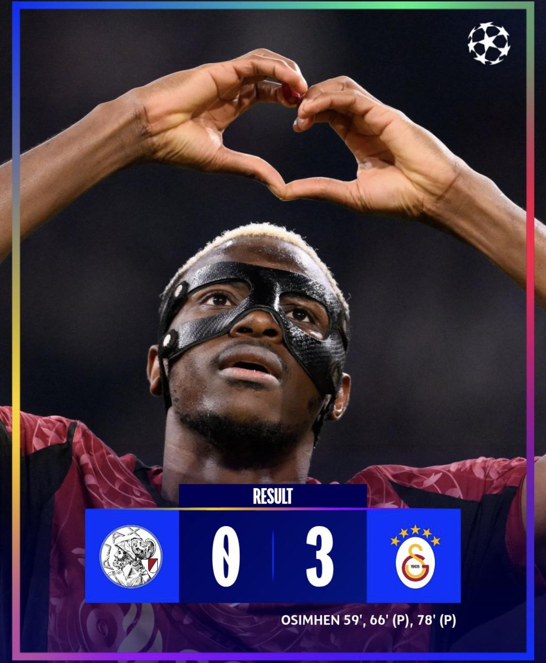 Super Eagles of Nigeria striker, Victor Osimhen, scored a hat-trick as Galatasaray beat Ajax 3-0 in their UEFA Champions League encounter, at the Johan Cruijff Arena in Amsterdam, Netherlands.