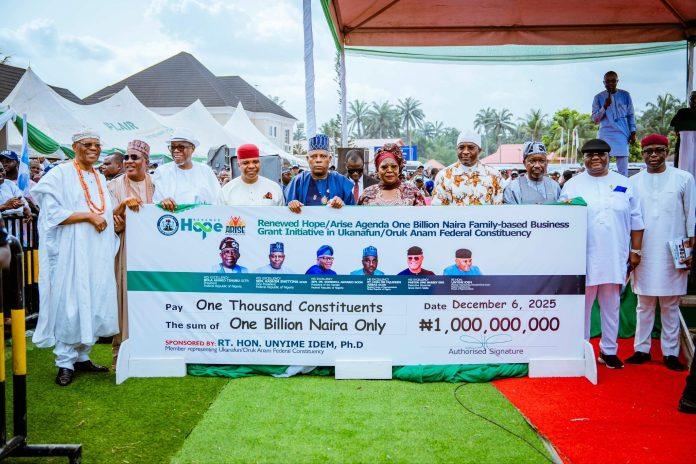 Nigeria’s Vice President Kashim Shettima has launched a ₦1 billion family-based business grant initiative in the Ukanafun/Oruk Anam Federal Constituency of Akwa Ibom State, describing the programme as a model for translating democratic promises into tangible economic empowerment at the grassroots.